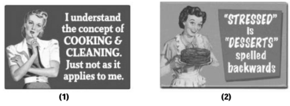 b) A tarefa doméstica a que o segundo imã se refere é a de cozinhar. O que nos permite chegar a esta associação é o fato de que a palavra “desserts”, que quer dizer “sobremesas” mas representa o ato de cozinhar, ser, em inglês, um anagrama da palavra “stressed” que significa “estressado ou estressada.”