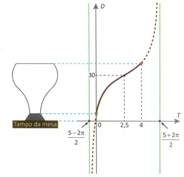 Um recipiente tem um formato que faz com que, ao ser enchido de água com uma vazão constante, a distância da lâmina de água ao tampo da mesa, em centímetros, aumente em relação ao tempo , em minuto, de acordo com uma função do tipo