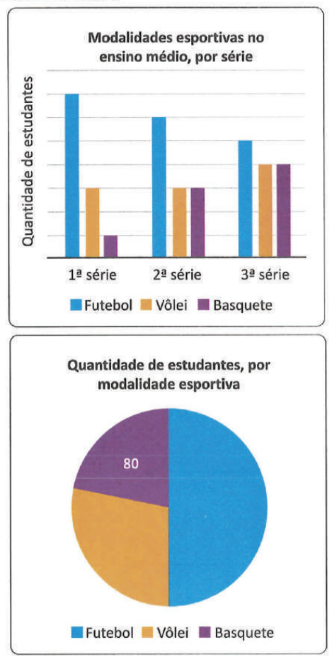 Em uma escola, todos os estudantes do ensino médio praticam uma das três modalidades esportivas oferecidas como atividade física, e cada um deles pratica somente uma dessas atividades. Os gráficos trazem alguns dados relativos aos quantitativos de estudantes que praticam essas modalidades esportivas nessa escola, apesar de algumas quantidades não terem sido informadas.