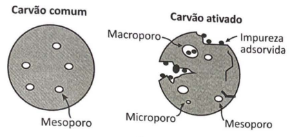 A filtração em carvão é uma das mais antigas formas de purificação de água. O carvão ativado, diferentemente do carvão comum, é útil para ser empregado na remoção de material orgânico, cloro e outros contaminantes. Essa capacidade decorre de suas propriedades de adsorção. A origem do material utilizado para produzir o carvão ativado pode influenciar sua porosidade e, consequentemente, interferir na capacidade do material de remover impurezas. Na figura, é ilustrada esquematicamente a diferença entre as estruturas físicas do carvão comum e do carvão ativado.