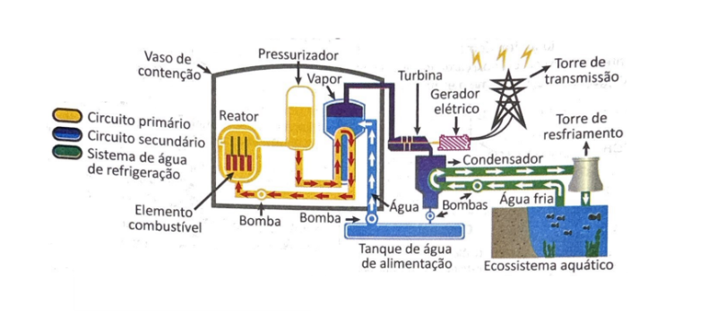 As usinas termonucleares são aquelas que produzem energia elétrica a partir da geração de energia térmica proveniente das reações nucleares. Normalmente, essas usinas funcionam por meio de dois circuitos, denominados circuito primário (vaso de pressão, pressurizador e bomba) e circuito secundário (gerador de vapor, turbina, condensador, tanque de alimentação e bombas), além de um sistema de água de refrigeração, formado por uma bomba ligada a uma fonte hídrica natural.