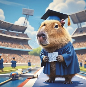 Essa imagem, chamada de “A formatura da capivara”, foi gerada por Inteligência Artificial (IA). Em 2024 estimou-se que 30 milhões de imagens foram geradas diariamente no mundo utilizando modelos de IA a um gasto energético médio de 131 kJ por imagem. O uso intenso dessa tecnologia tem levado à reativação de usinas termoelétricas e à construção de novas usinas nucleares para suportar os servidores que realizam o processamento de IA. Considerando que toda a energia para gerar essas imagens fosse proveniente da combustão completa de carvão, a pegada de carbono diária medida em toneladas de CO₂ formado, resultante da produção dessas imagens, seria de