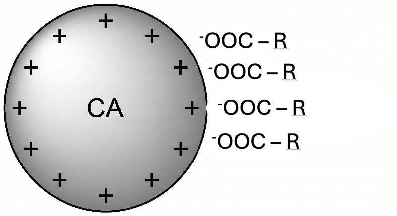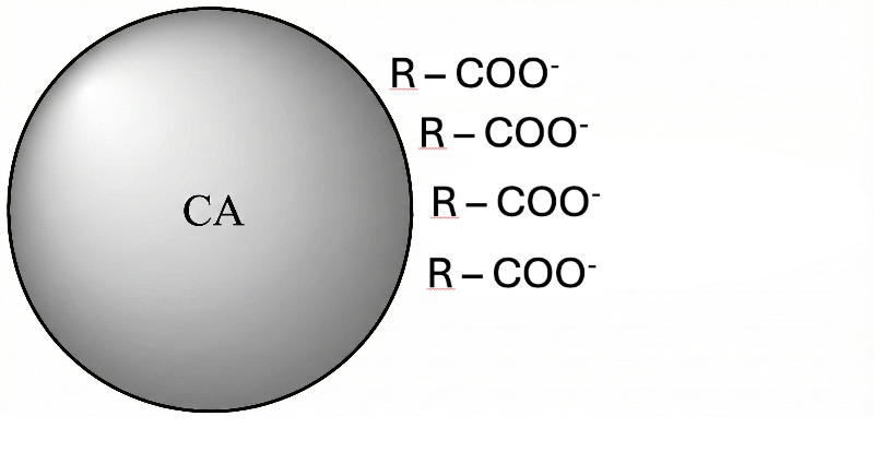Como a superfície do carvão possui cargas positivas e a "cabeça" da molécula orgânica possui carga negativa (ânion), a molécula deve ser desenhada com a parte polar (cabeça com o grupo funcional iônico) voltada para a superfície da esfera, tocando as cargas positivas. A cadeia carbônica apolar (R-) fica voltada para fora.