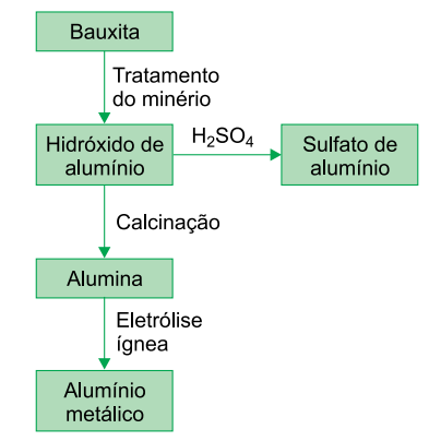 A bauxita é o principal minério de alumínio. A partir desse minério, obtêm-se diversos compostos de alumínio, dentre eles o hidróxido de alumínio, , a partir do qual se obtém o sulfato de alumínio, . O principal uso desse sulfato ocorre nas estações de tratamento de água (ETA). Outro composto obtido a partir do é a alumina, , a partir da qual é obtido o alumínio metálico, , por eletrólise ígnea. O esquema resume essas informações.